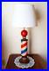 I made this wooden barber pole back in 1982 and turned it into a lamp (a lamp shade is not included). The lamp shade in these photos is for display purposes only and will not be included. This lamp was a display model for my wooden barber pole business that I started in 1982. The pole is hand-turned on a lathe and hand-painted by me. This antique-looking pole is made of pine and was made to look like an old cracked or checked barber pole from the 1800s. Most wooden poles back then eventually cracked with age, so as you can see, this pole is checked or cracked, which gives it the look of being over 100 years old. I added an antique finish over the pole to age it. The pole by itself is 18 inches tall, while the total height (barber pole plus lighting fixture) of the lamp is approximately 30 tall. The barrel (where the red, white, and blue stripes are) is about 3 3/4 inches in diameter. The base of the pole is about 6 1/4 inches in diameter. The red ball or globe on top measures 3 3/4 inches in diameter. The lamp is in great condition because it was packed away for more than 40 years. It would make a perfect display piece in a home, office, a collection, or a barber shop. While this pole is over 40 years old, it is not classified as an antique since that designation requires it to be at least 100 years old, but it does qualify as vintage. A quick history of the barber pole: Originally, barber poles in the USA had only red and white stripes, but before there were barber poles as we see them today, the barber had a tall pole (usually white) outside the shop. Back in those days, barbers not only cut hair, but some were also surgeons and dentists. If you had high blood pressure, they would bleed you, and then they would wrap the wounds with long cloth bandages. Since the bandages would get soaked in blood, the barber would hang them up to dry on the pole outside before they were either washed or thrown away. If they didn’t dry them first, then they would start to smell like something had died. When there was a breeze or wind, the now red bandages would wrap around the pole in a spiral pattern. Eventually, barbers started painting a red spiral stripe around a white pole, which signified they were a barber-surgeon. Many years later, American barbers started adding a blue stripe to the pole, either to represent blood veins or to Americanize the poles with the flag colors. As we know now, barbers can only cut hair and do shaves but they still basically use the same sign as they did centuries ago. A little history about me and my barber poles. As far as I know, I was the only wooden barber pole maker around at the time and probably the last company in the US still making wooden barber poles as a business. In 2005, I closed my shop and packed away all the barber poles that I had left. They’ve been in storage and haven’t seen the light of day until recently. There are probably around 20 poles left, plus a barber’s clock. The tallest pole is around 5′-4 tall. I want others to enjoy them rather than keeping them packed away in a storage unit, unseen. I registered it clear back in 1998 when the internet was still very young.